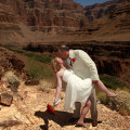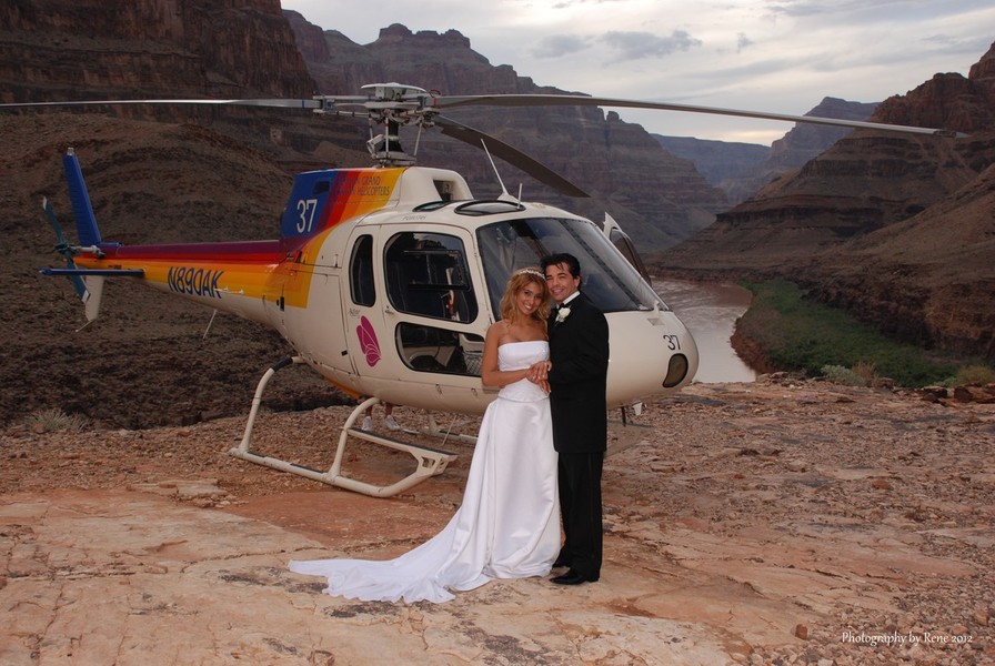 Una limusina los recogerá en el hotel y os llevará al helipuerto donde embarcaréis en un helicóptero privado para disfrutar de un viaje de 40 minutos sobre el lago Mead y la presa hoover hacia el laberinto de rocas y valles. Descenderéis y aterrizaréis cerca del suelo del cañón donde intercambiaréis vuestros votos matrimoniales. Un pastel y champange os estarán esperando bajo una auténtica palapa india.