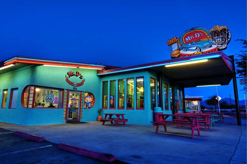Hoy llegamos a California, el último estado de nuestra legendaria Ruta 66. Cruzamos la zona de Devil y nos dirigimos a lo largo del desierto de Mojave, que ofrece el escenario más dramático de California... balanceándonos a través de una vegetación exuberante, asombrosas formaciones volcánicas, largas hileras de árboles Joshua e incluso en algunos sitios, bosques de pinos. Del desierto pasamos directamente hacia los fríos pinares de las montañas de San Gabriel y llegamos a Victorville, donde pasaremos la noche.